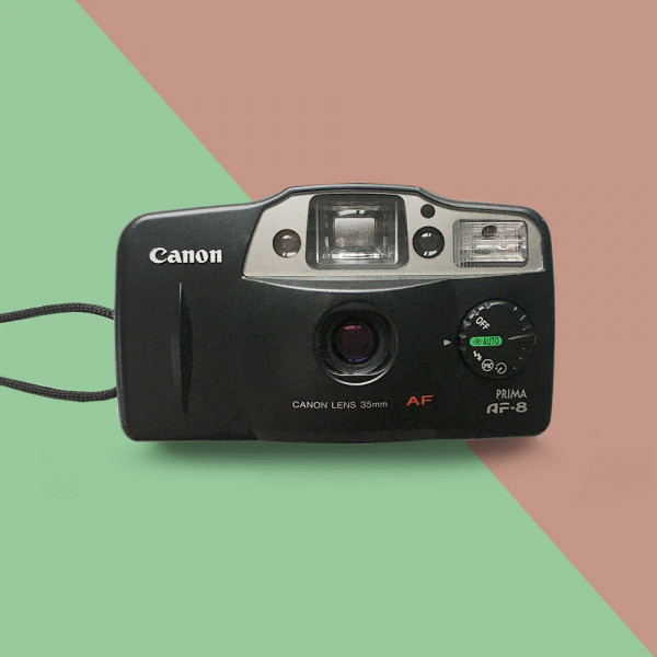 Пленочный фотоаппарат Canon Prima AF-8 в состоянии нового. Эта компактная автофокусная 35-мм пленочная камера была известна как Prima AF-8 в континентальной Европе и Sure Shot Owl (сова) для американского рынка. Примечательна большим и ярким видоискателем.
