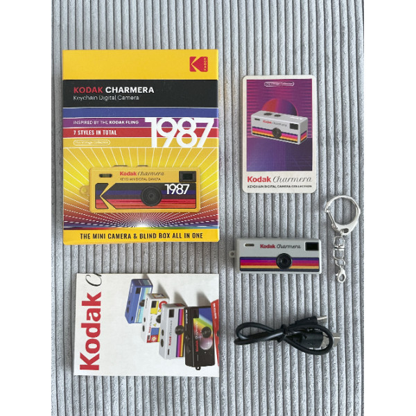 В каждую коробку-брелок входят цифровая камера KODAK Charmera, кабель USB-C для зарядки и брелок. Карта памяти в комплект не входит. Матрица изображения 1⁄4 дюйма CMOS, объектив 35 мм F2.4, разъём USB-C, поддерживаемый формат карт памяти Micro SD емкостью от 1 до 128 ГБ. Разрешение изображения 1440 x 1080, 1,6 мегапикселя, частота кадров записи видео 30 кадров/с, размеры устройства 58 x 24,5 x 20 мм, вес всего 30 грам!